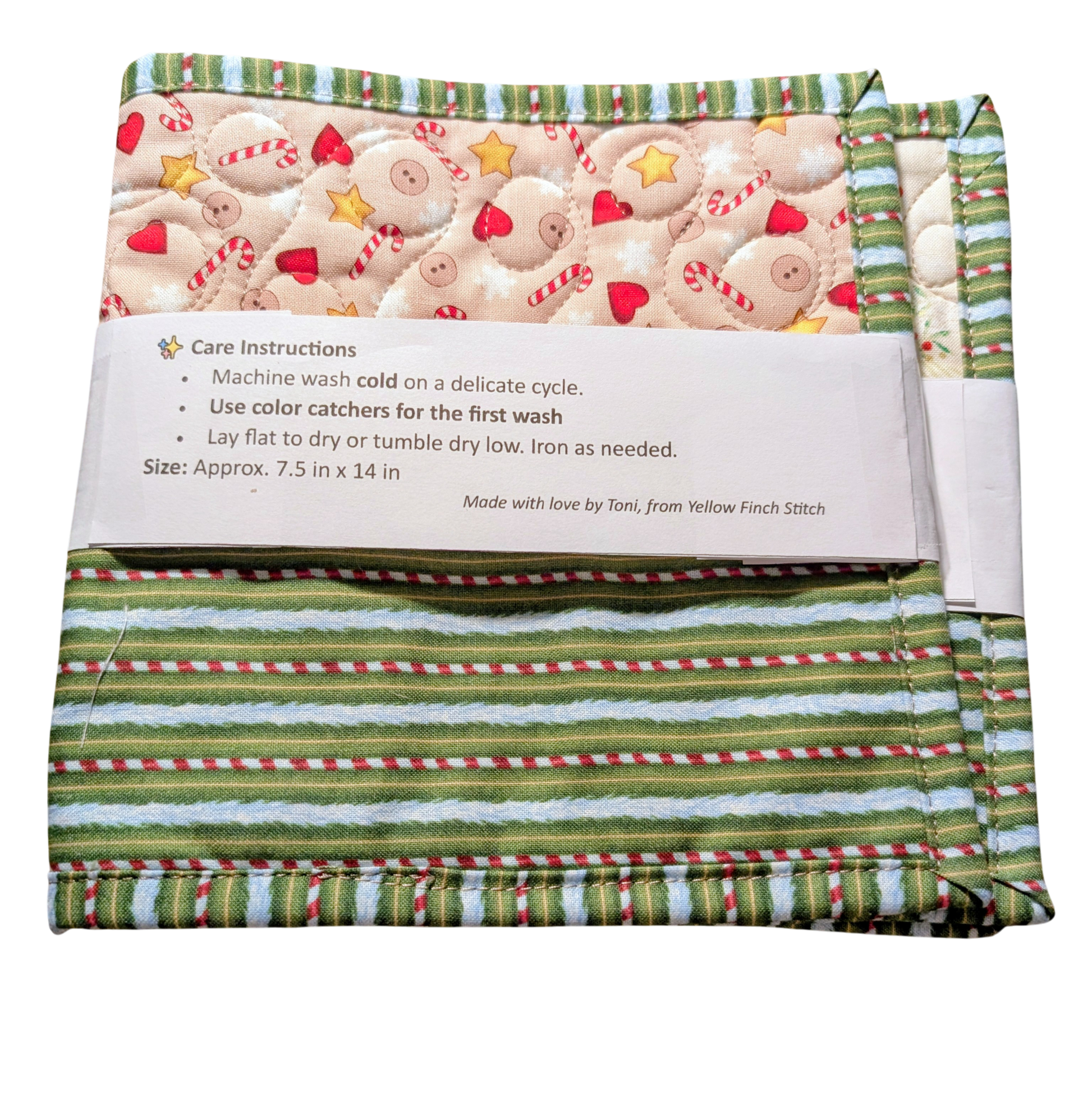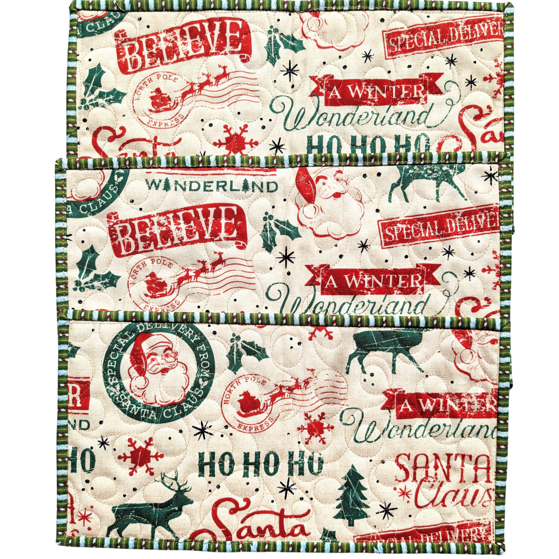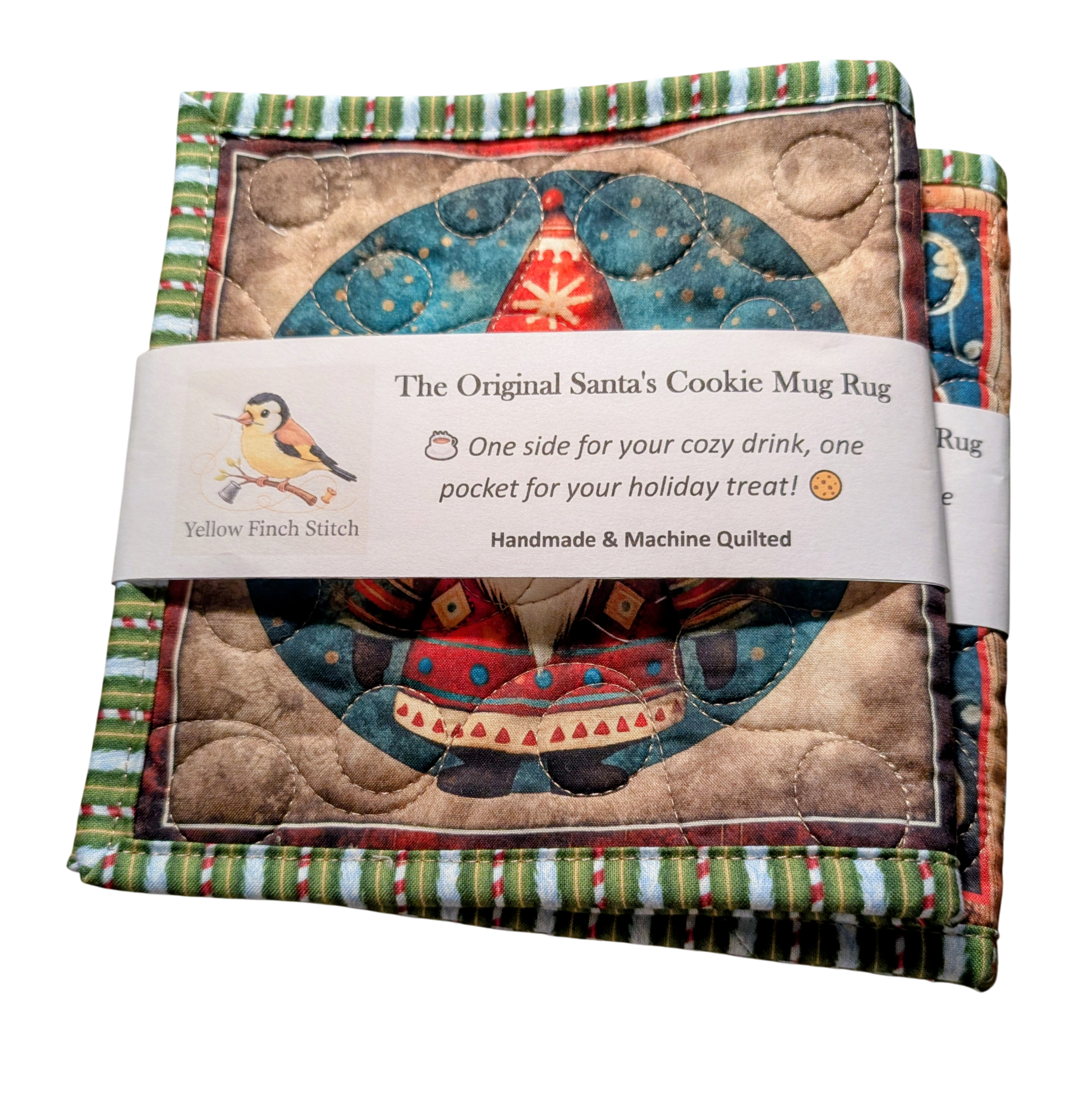 These are our Santa's Cookie Mug Rugsβ€”it's the perfect little mat for a cozy night! You put your cocoa mug on the left and the cookie goes right in the pocket. Since they are fully machine-quilted and finished with a durable, double-fold binding, they are meant to last for years of holiday seasons. They are a premium, handmade item, but they also make a wonderful, unique gift. Many people grab a set of twoβ€”one for them and one for Santa!